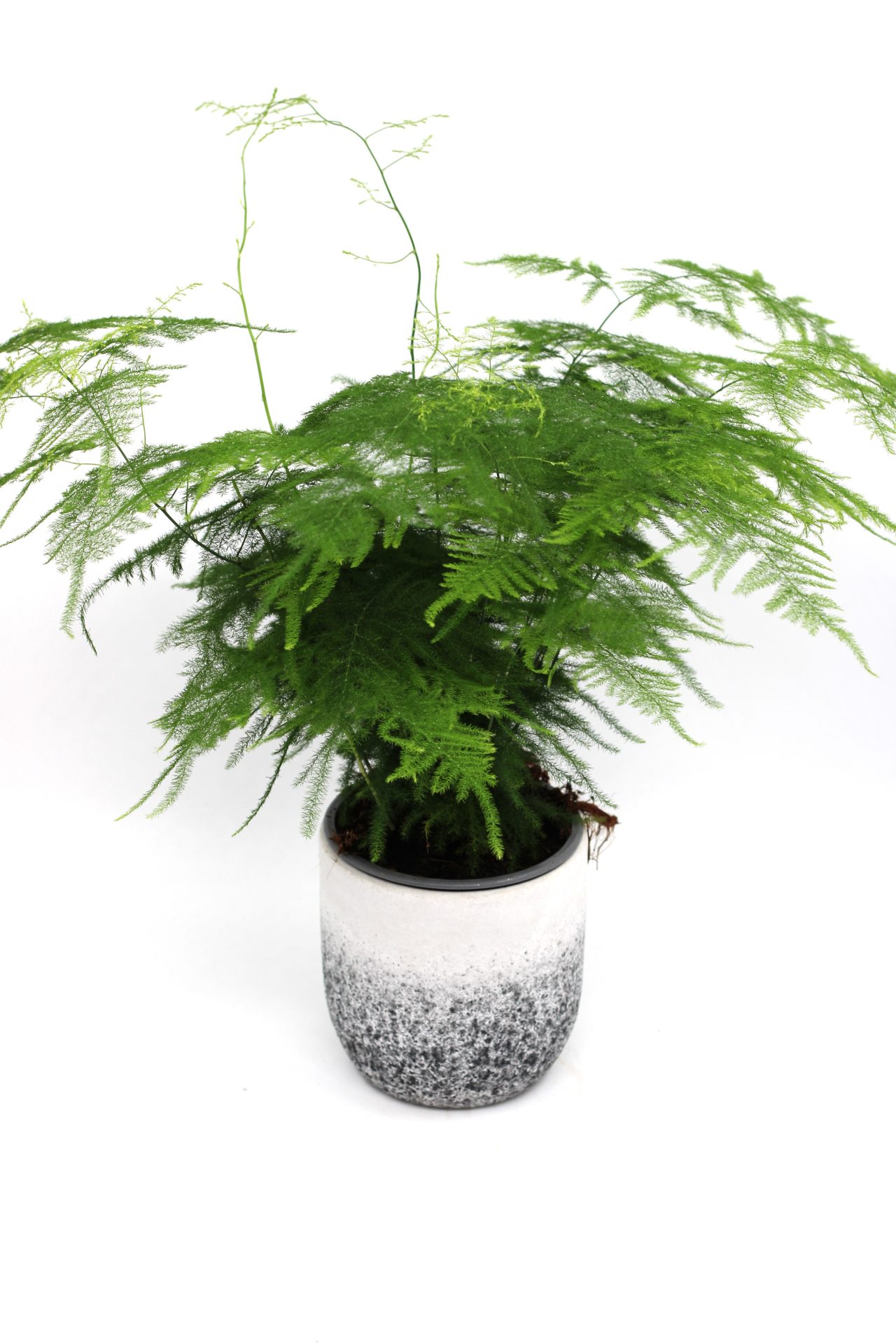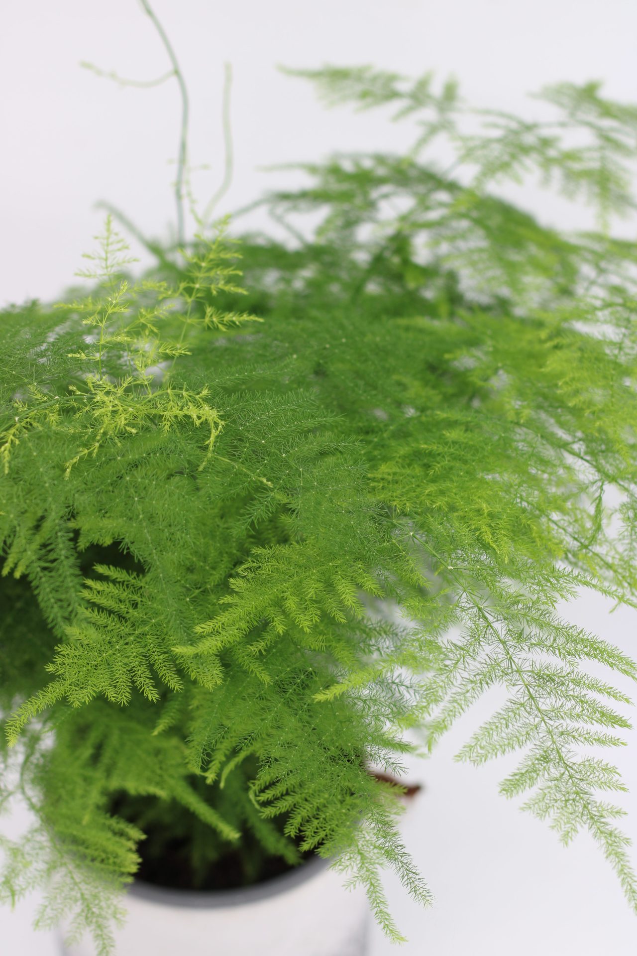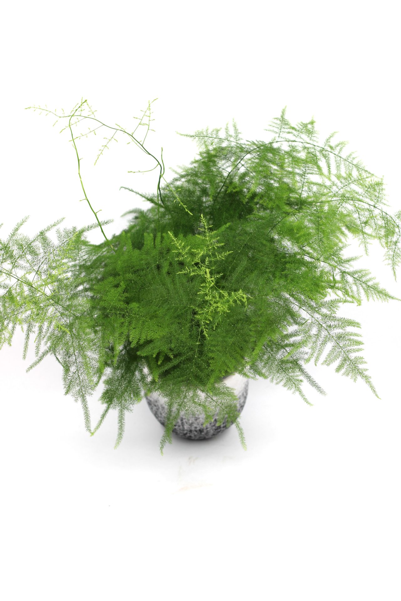 Esta Asparagus, também conhecido como o aspargo-samambaia, é uma planta com folhagem plumosa muito elegante que se estende horizontalmente e com caules longos. No final do verão pode desenvolver pequenas flores em forma de sino. Apesar da sua aparência suave tenha em atenção no seu manuseamento, pois com a sua maturação desenvolve uns pequenos espinhos. As bagas roxas que pode produzir não comestíveis, pode causar irritação da pele, mantenha afastada do alcance de animais e crianças.