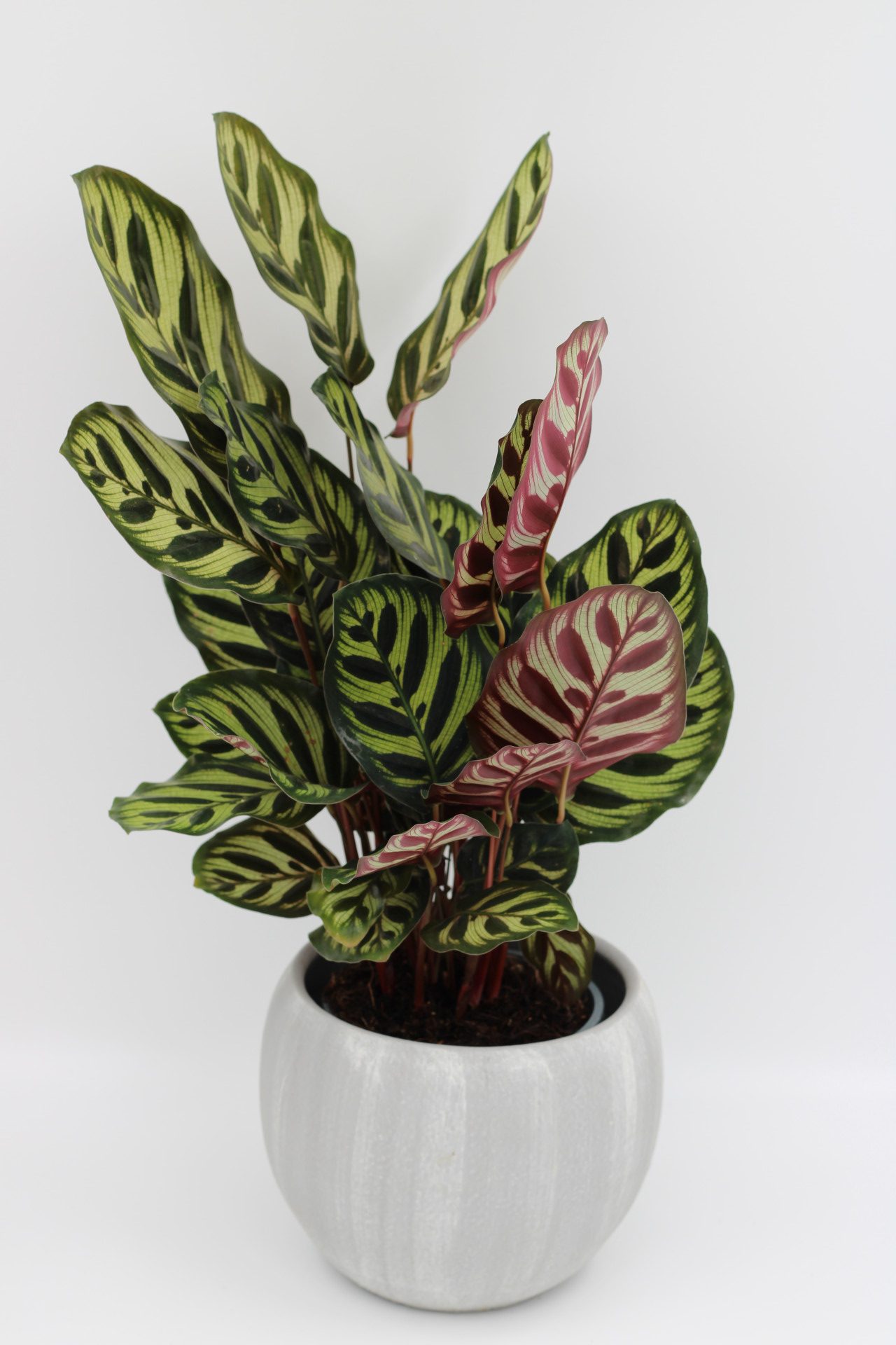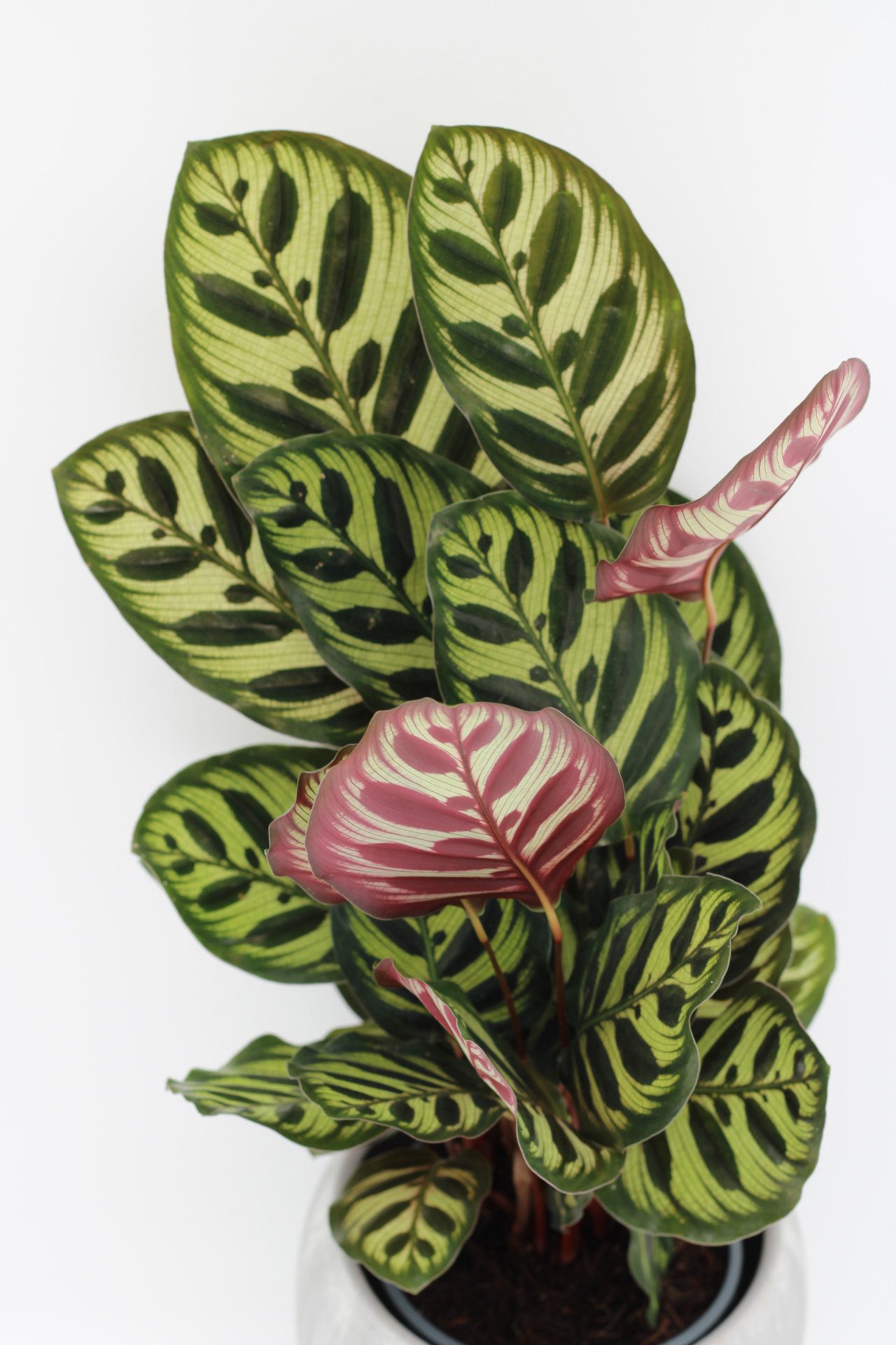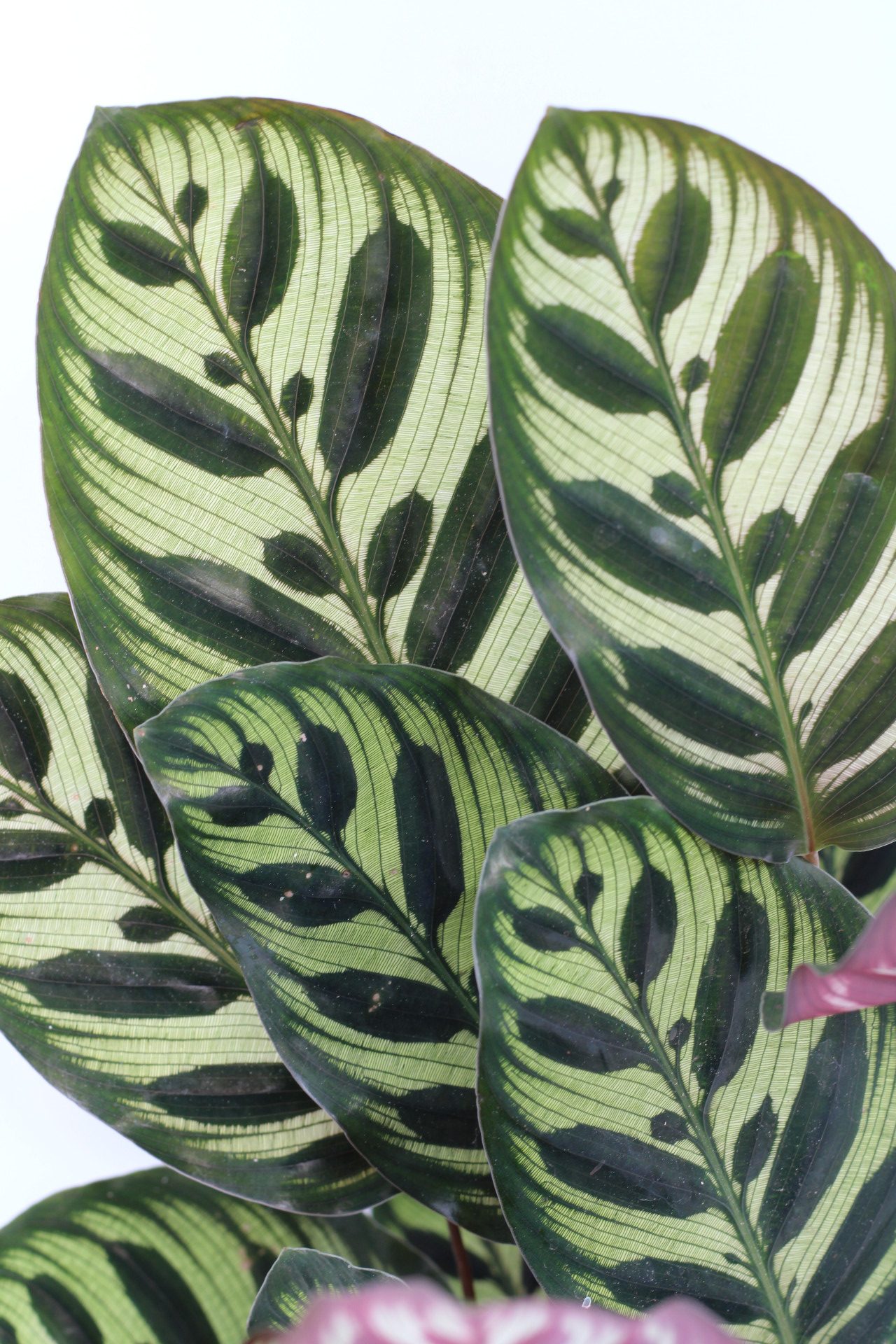 A Calathea makoyana, também conhecida como planta pavão, é uma das mais exuberantes da família. A folhagem é hipnotizante e vasta sendo uma perdição para qualquer entusiasta de plantas tropicais. As folhas são matizadas com “pinceladas” verdes escuras em fundo verde claro, com a margem inferior vermelho bordô. As Calatheas são conhecidas como ‘Prayer Plants’ por abrirem as folhas para receberem mais luz durante o dia e fecharem, esticando-as para cima durante a noite.