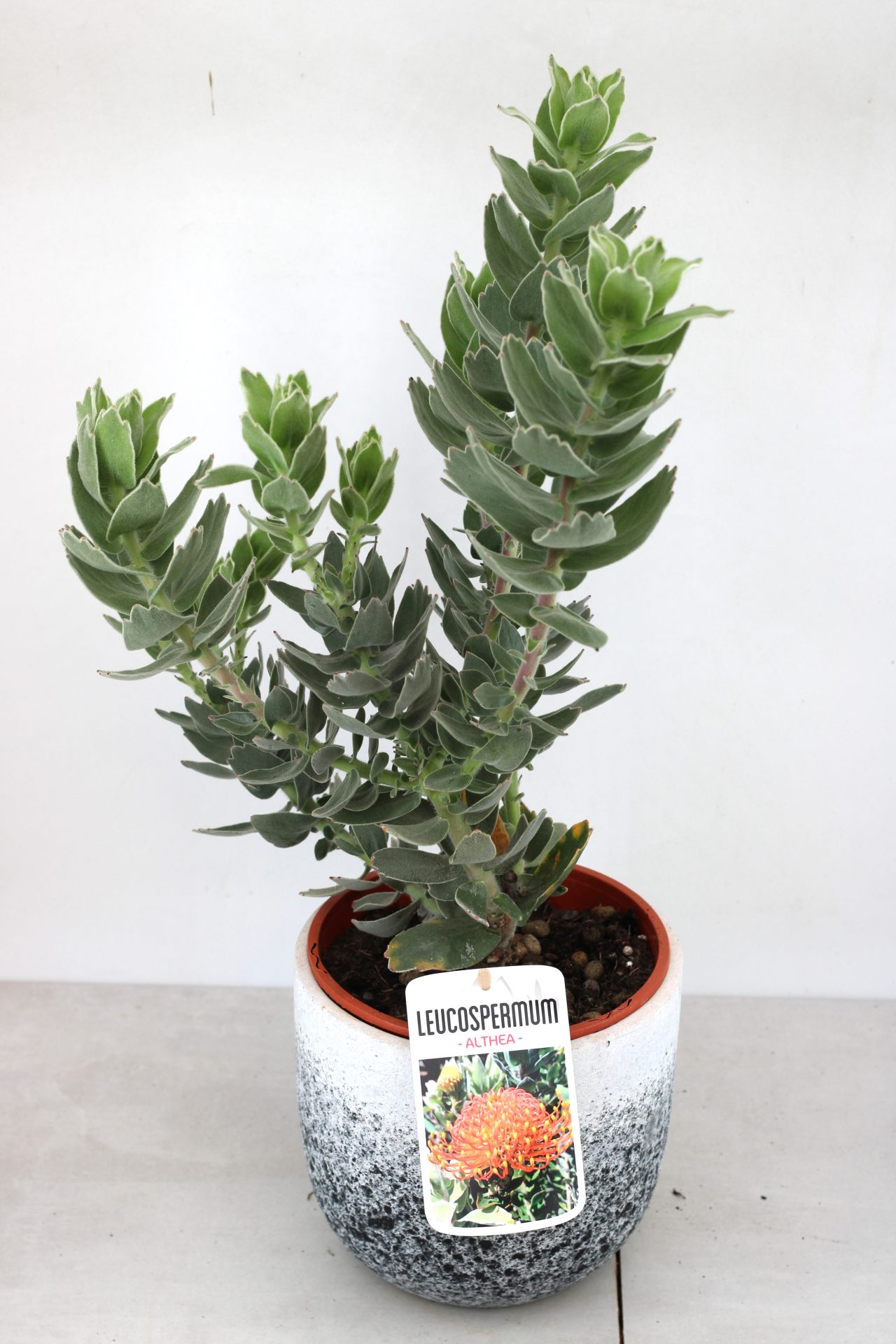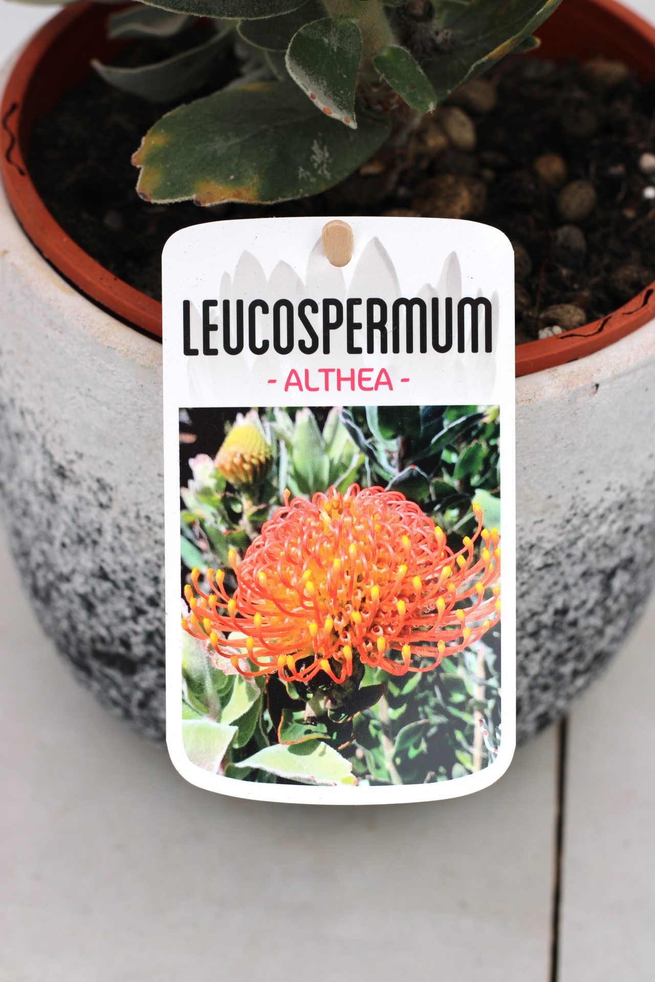 O leucospermum althea apresenta flores em forma de almofada, de um laranja vibrante, com pontas num tom amarelo quente e uma forma arredondada e elegante. É versátil, adequado para jardins e vasos, com muitas flores durante a primavera. Ideal para um jardim de baixa manutenção e baixo consumo de água.