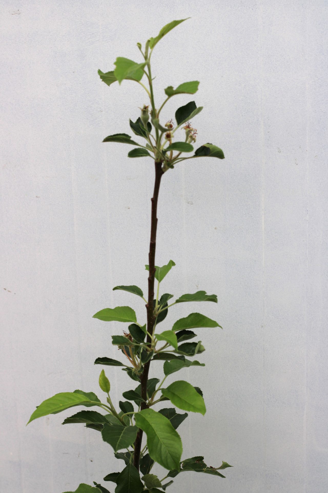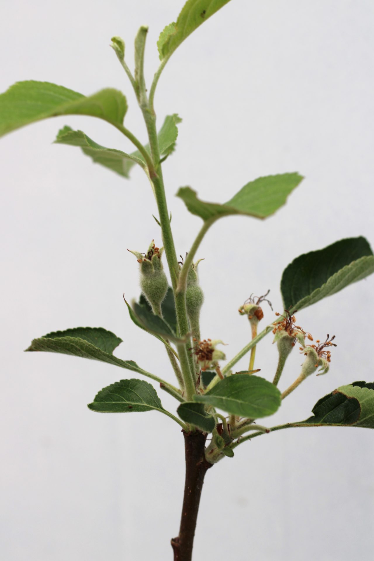 A macieira Fuji produz frutos gordos de cor vermelho claro sobre fundo verde-amarelo, tem a casca suave e perfumada, estalante e sumarenta.