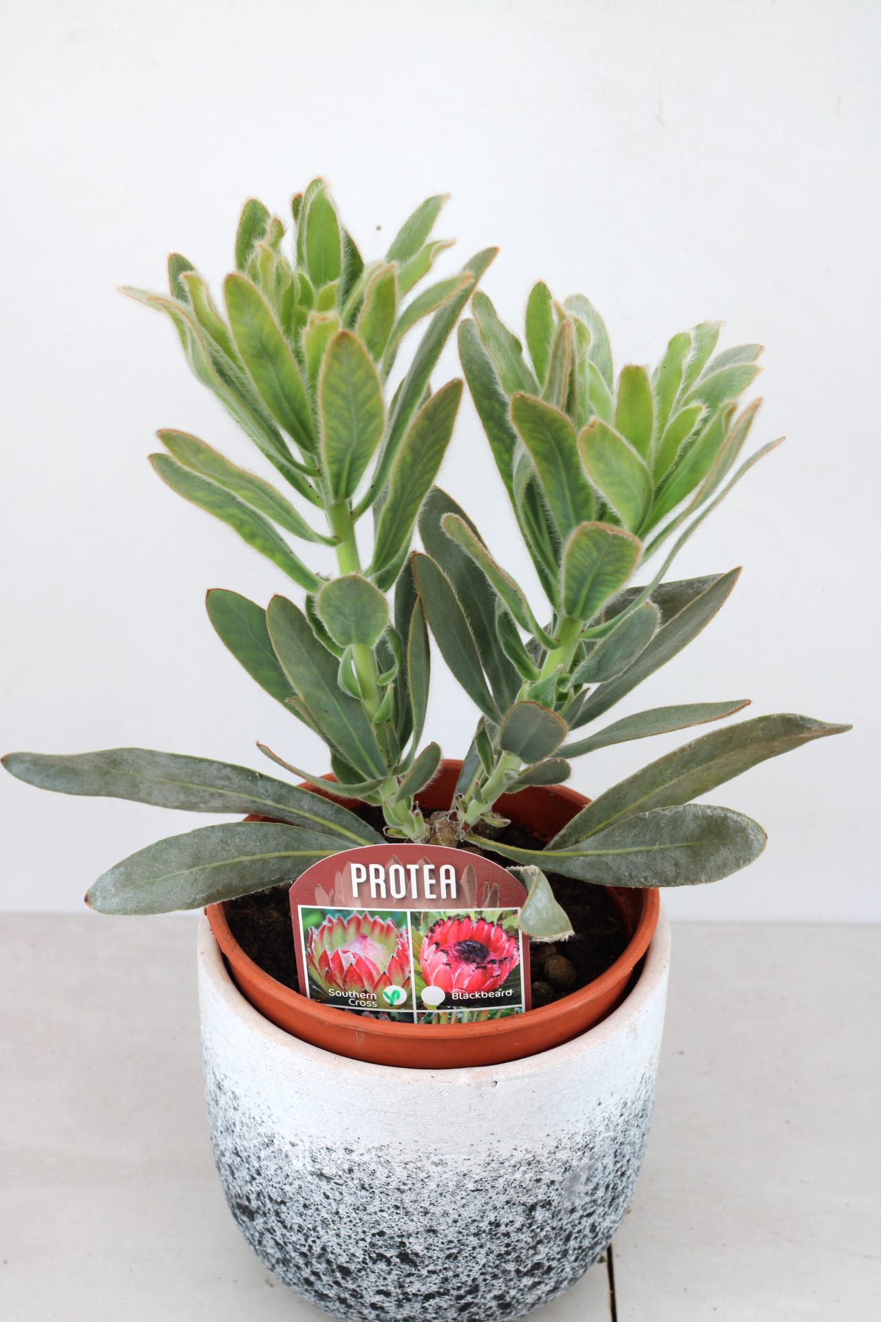 Protea Southern Cross, uma notável híbrida de Protea com floração no inverno. Esta extraordinária Protea possui tolerância à seca e um notável grau de tolerância à geada, uma vez firmemente estabelecida. Além disso, demonstra uma impressionante capacidade de prosperar em solos mais pesados, o que a diferencia de muitas outras variedades de Protea. A Southern Cross é o resultado bem-sucedido do cruzamento entre a Protea magnifica e a obtusifolia.